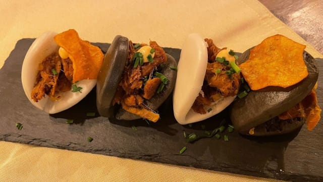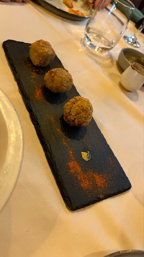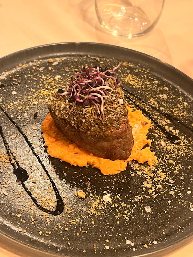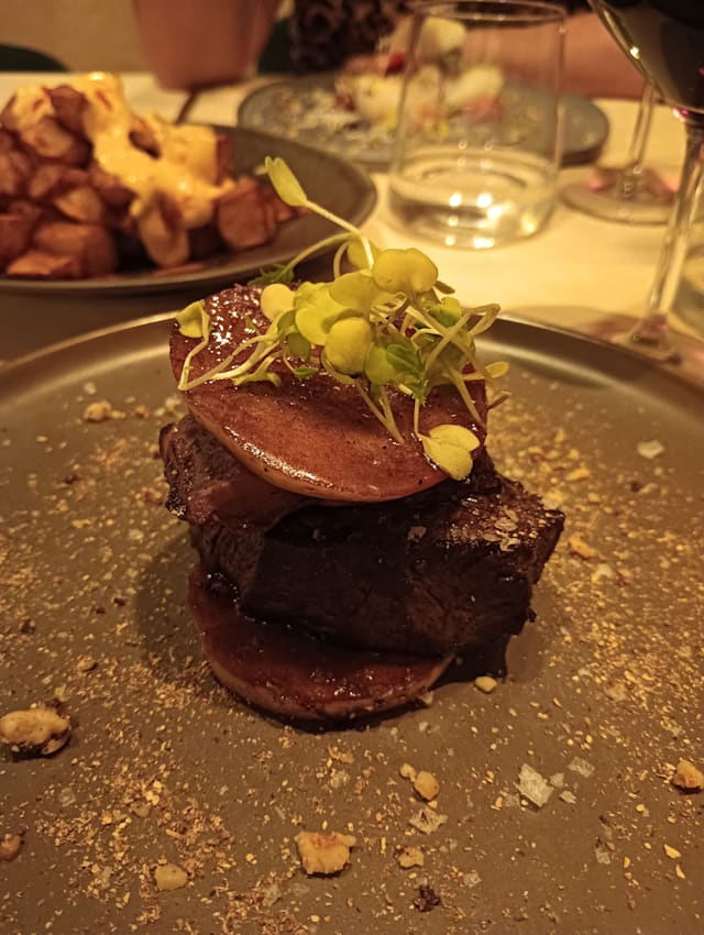 10/10+2We absolutely loved this place. It was one of those meals where everything just clicked—the food, the atmosphere, the service, all of it. We had several delicious dishes, but a few really stood out. The patatas bravas were incredible—served with a rich, unique sauce that elevated the whole dish. The homemade croquettes, made with aged meat, were packed with flavor and just melted in your mouth. And the solomillo… wow. It came on a potato base with mushrooms and the most amazing sauce—absolutely unforgettable. Dessert was just as impressive. The hazelnut and parmesan cheesecake was such a surprising and delightful combo, and the pistachio dessert was fantastic too. We also had their homemade vermouth, which was excellent—so smooth and flavorful. What made it even better was the vibe of the place. It’s a beautiful restaurant, stylish and welcoming, and the service was top-notch. Our waiter was so attentive and genuinely added to the whole experience.