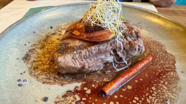 Solomillo madurado de rubia gallega perfectamente cocinado a la brasa, sobre manzana caramelizada al vino tinto con canela y foie. (250 gramos)