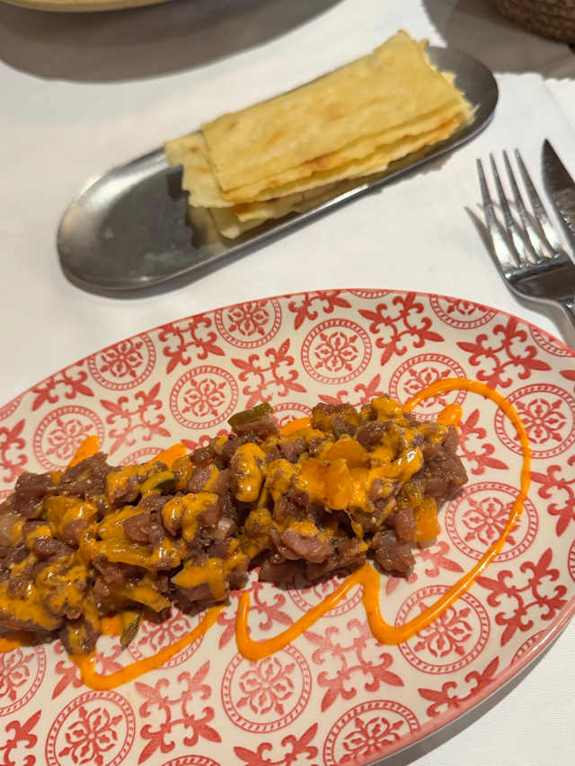 - Tàrtar de tonyina, maduixes i xoriç ibèric amb rovell de l'ou