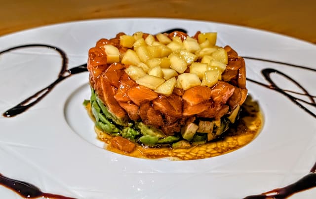Tartar de bogavante y tomate con aguacate y vinagreta de jamón