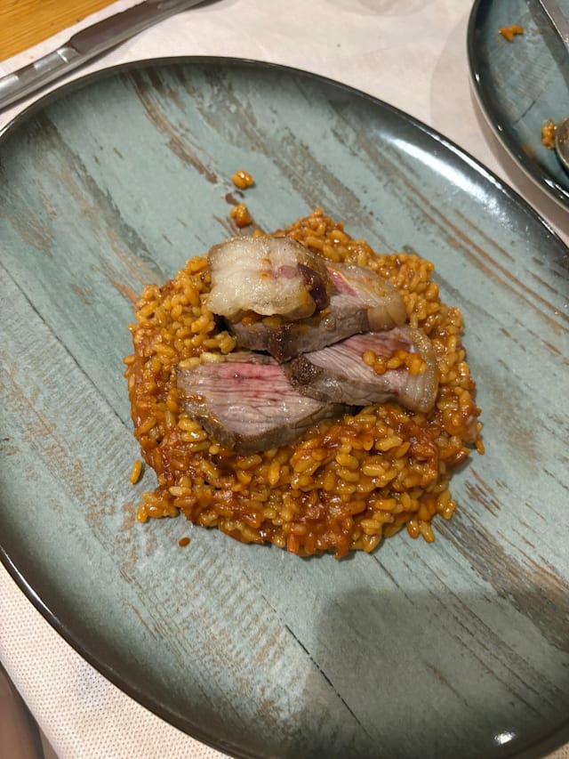 Secreto ibérico con parmentier de patata, champiñones salteados, salsa española y espárragos trigueros