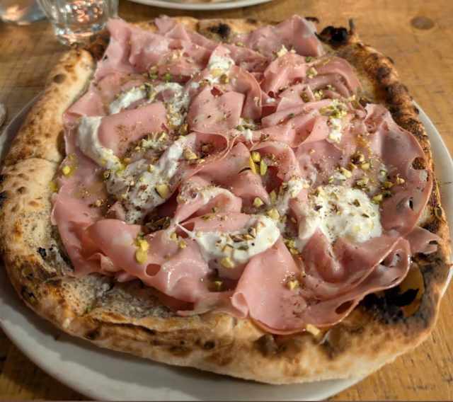- Salsa trufada, mortadella, stracciatella, pistacho, pimienta negra