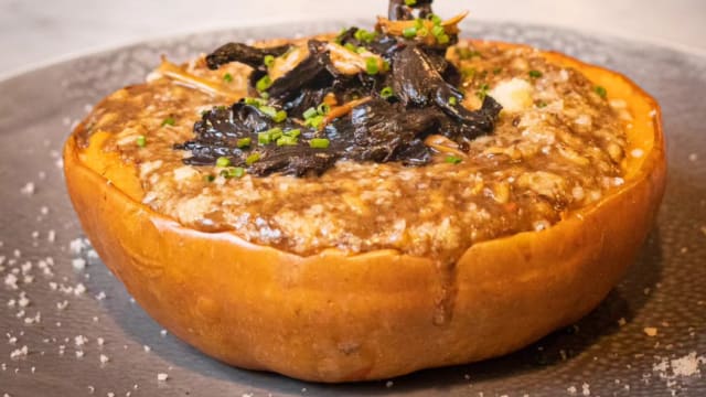 Cazuelita de setas silvestres con queso, huevo y parmentier trufado de calabaza