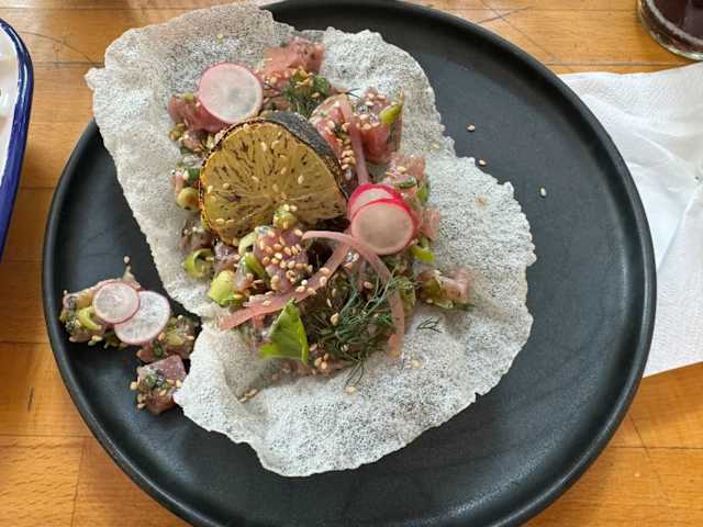 - Pinsa trévise scott, crème fraiche, trévise, scarmoza, pesto, lomo, noisette, poire -demi
