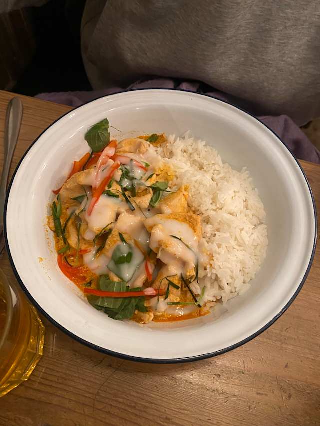 - émincé de poulet dans une sauce au curry panang, lait de coco, feuilles de citron kaffir et basilic thaï