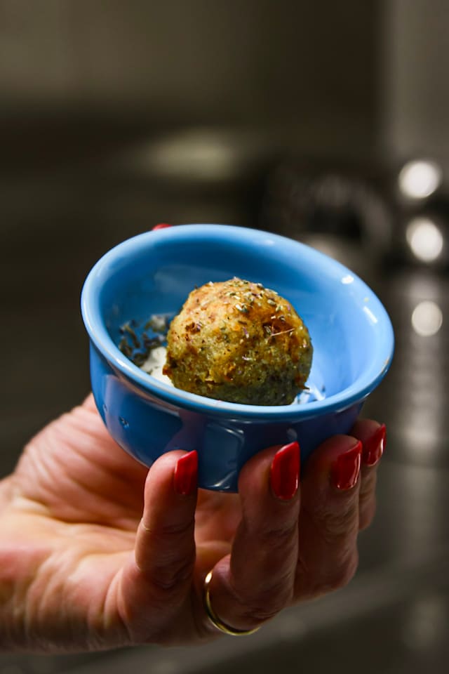Polpetta di pane e salsiccia secca con maionese di albumi e pulieio