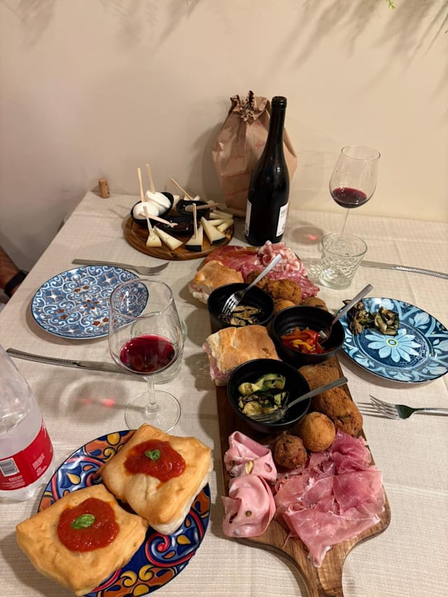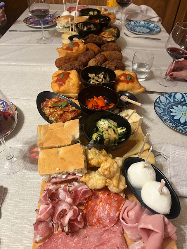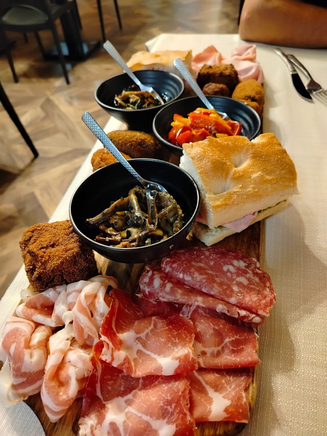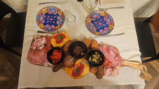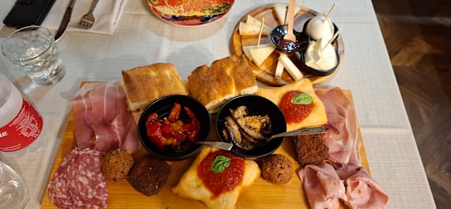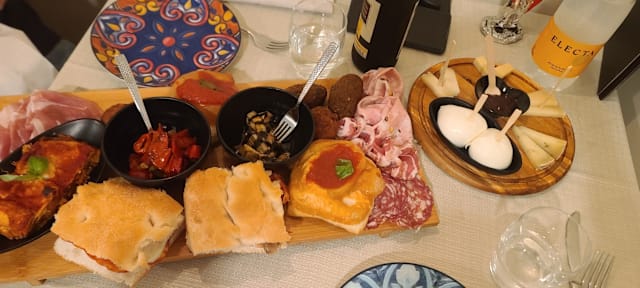 Focaccia, tarallini, olive, salumi, formaggi, bibita a scelta tra non alcoliche, spritz, ichnusa non filtrata o calice di vino