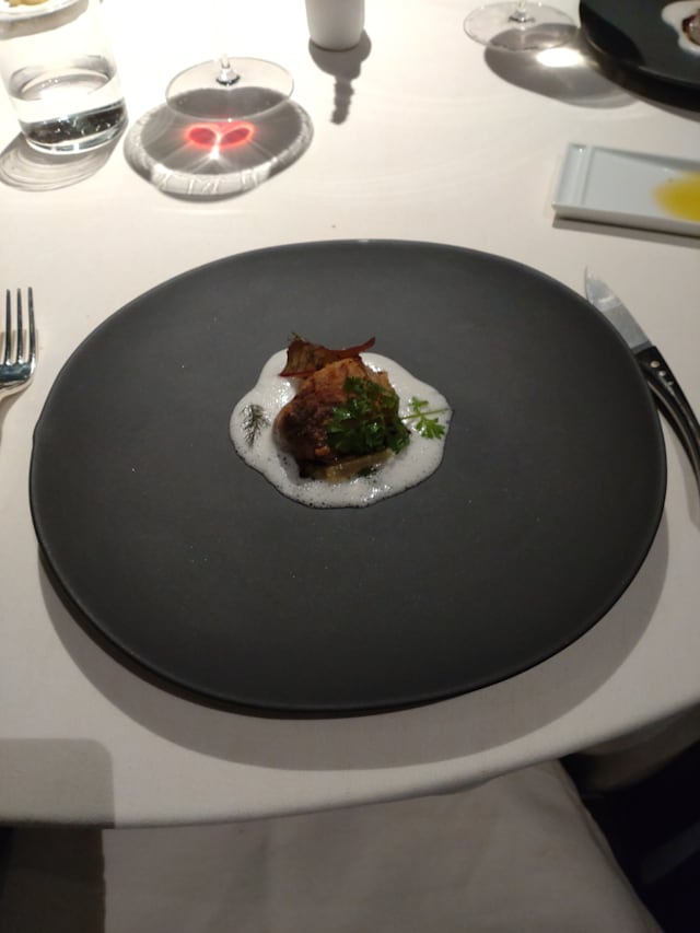 Animella di vitello, bagnet verd, anguilla affumicata e vermouth bianco