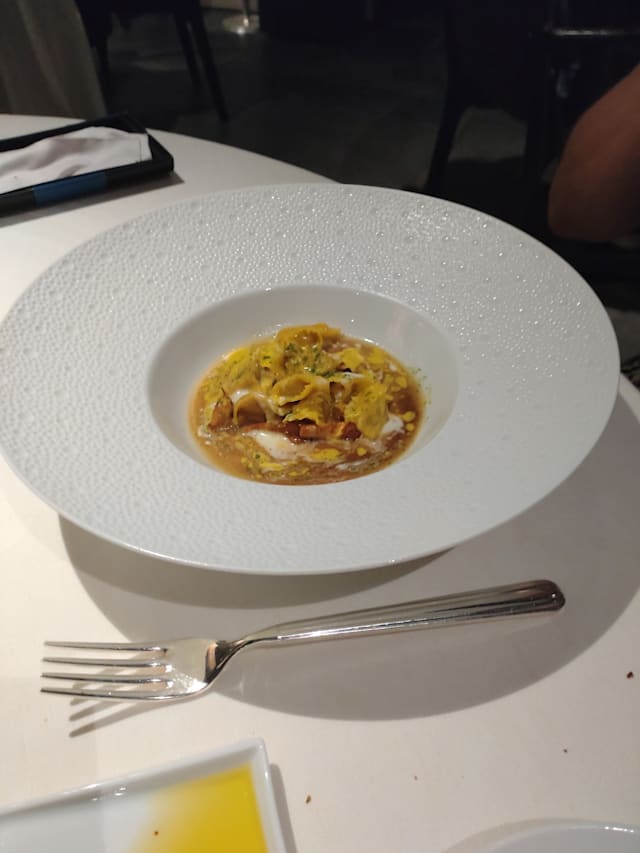 Plin di gallina bianca, funghi, gorgonzola e zafferano