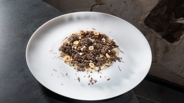 Piccione, aglio nero, arachidi salati e cristalli di nebbiolo