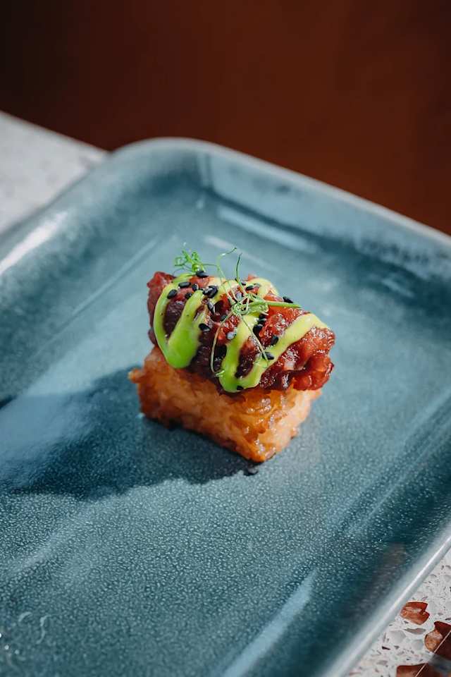 - Crocchetta ripiena di besciamella aromatizzata alla pasta kimchee con sashimi di Australian Wagyu e mayo affumicata