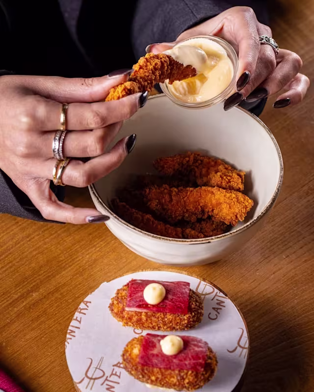 - Pollo in panko, lattuga romana, mayo Cantera e chips di rucola