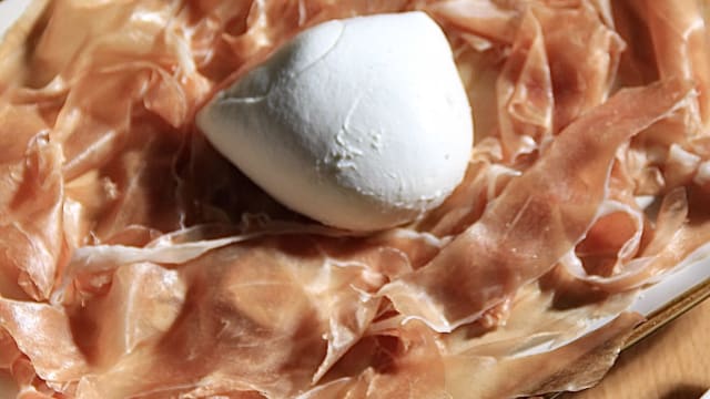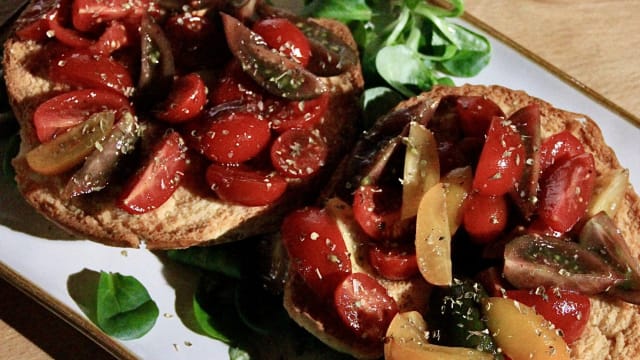 Tartare condita, parmigiano, pomodori, valeriana e noci.