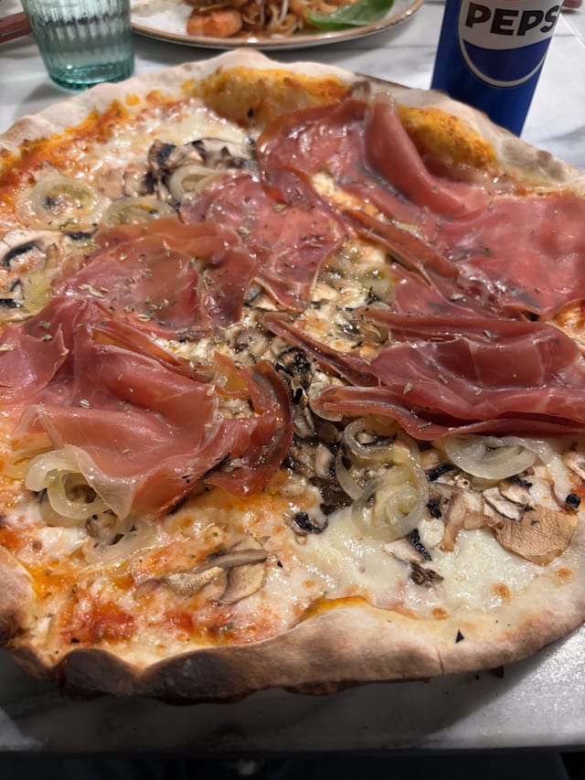 Tomate, mozzarella, espinafre em folha, presunto, queijo talegio, creme de balsâmico e oregãos