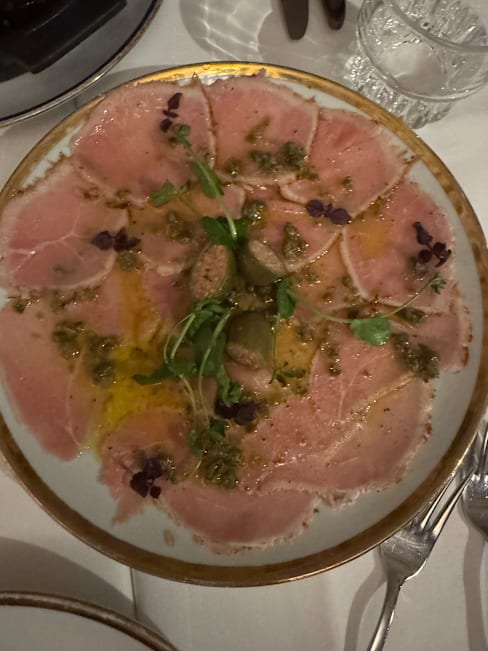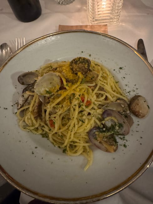 7.5/10We had cocktails first , followed by a veal carpachio which were both great. One of us is gluen free, so we ordered the pasta Bolognese (non gluten free ) and the Lobster linguini gluten free to share. The Pasta Bolognese was wonderful, per my husband, but the lobster linguini waas very soggy and not at all al dente. The staff was very accomondating about skipping that course and did not charge us for it. The last course was the sea bass and it was deliciious. The meal took a long time to be served, as we arrived about 7, but in all fairness didn't order our entrees until 7:45 but the final course was not served until after 9 PM. We were not in a hurry, but that did seem to take longer than we expected.