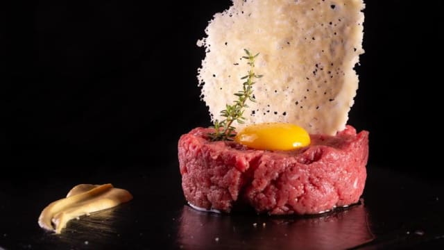 artare di manzo battuta al coltello con capperi,acciughe,uovo e cipolla con cialda di parmigiano