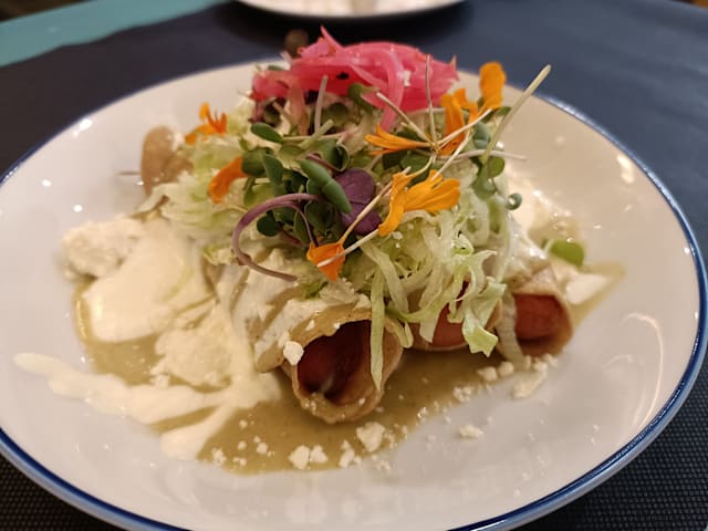 Bañada con salsa de chile habanero y mango, coronada con cebolla roja encurtida