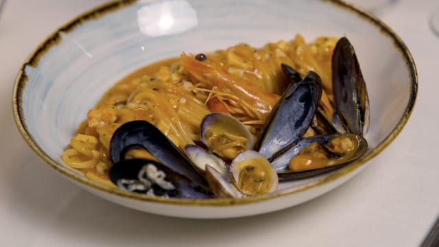 Con scampi, pomodoro e bisque di crostacei. Minimo per due persone
