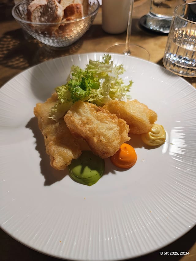 Baccalà in tempura, datterino rosso, zafferano e cavolo