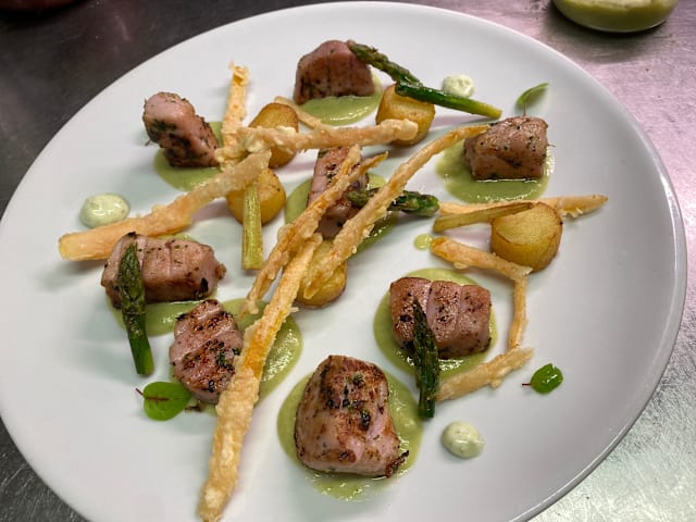 Polpo in doppia cottura (sottovuoto a bassa temperatura - rosolato) su vellutata di patate