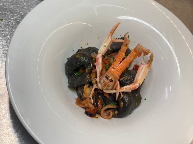 Taglierini al nero di seppia con pomodori pachino e pesce spada