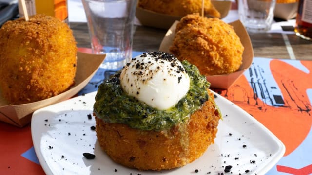 Arancina al piatto con spinaci, mozzarella di bufala e polvere di olive nere.