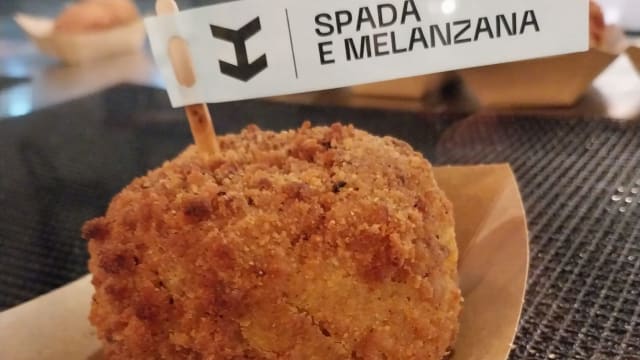 Melanzana fritta, pesce spada , pomodorino, vino bianco, olio extravergine d'oliva, menta, sale.