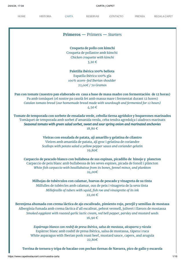 10/10+4The use of seasonal vegetables in every dish makes this a thoughtful and imaginative restaurant. It’s easy to get the meat produce in other parts of the world through freezing and shipping. But the truly fresh vegetables have to be harvested and cooked immediately. Capet does this so well and blend the different vegetables with the seafood and meat produce carefully. The service is impeccable and warm. I enjoyed the welcome and the care throughout the meal.