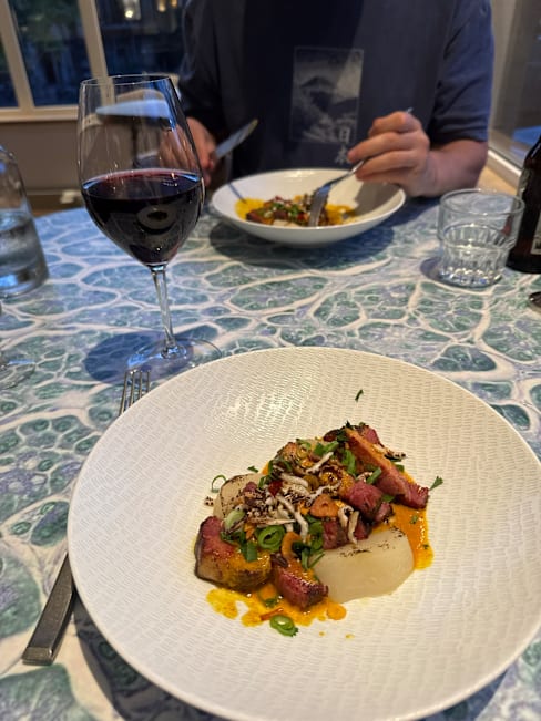6/10Wanted to love this place, but the food was not great. Reggie was a good sommelier, and the wines were good. The ravioli was not good; dry and bland. The hen seemed like it had been murdered under a heat lamp with a dehydrated scallion as its last best friend dying in the desert. The sea bass was good according to our other family members. No one asked us if we liked the food. We didn't. The restaurant itself is a nice atmosphere. I wouldn't eat here again.