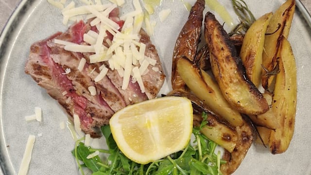 Insalata verde, pollo ai ferri, crostini, grana a scaglie, salsa caesar