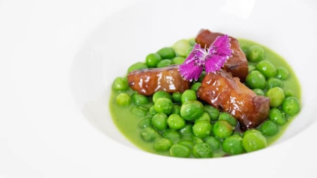 Verdura de temporada con papada ibérica confitada sobre crema de primavera