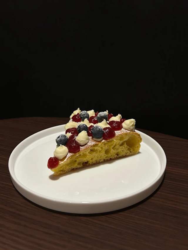 - Trancio di pizza dolce (impasto soffice), namelaka al cioccolato bianco, gel ai frutti rossi, frutti rossi.