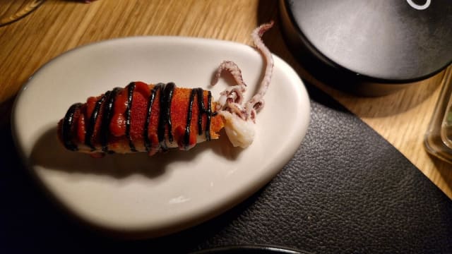 Calzone con sashimi di ricciola, insalata di mele e spinaci e maionese orientale