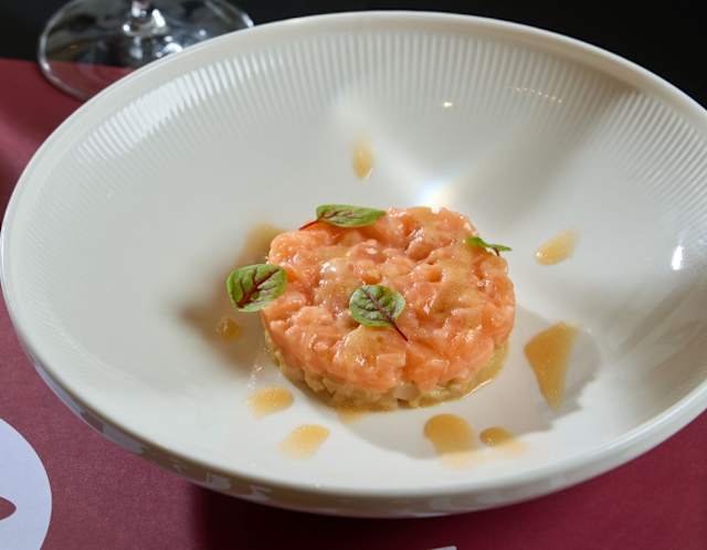 Tartare di tonno rosso mediterraneo condita con dressing al lampone e servita su un chutney di mela, sedano e pepe di Timut.