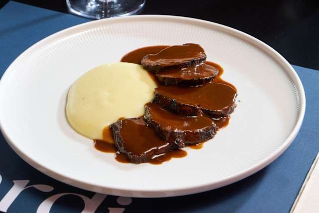 Antica ricetta di rovato. Brasato di cappello del prete con cottura confit per 48 ore a 70°c. servito con la sua salsa di verdure, parmigiano, pane grattugiato e un poco d’acciuga, accompagnato da patate al forno.