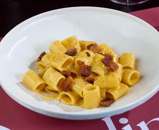 Salsa di tuorlo d’uovo categoria a, pecorino romano DOP, mix di 3 pepi, guanciale amatriciano croccante.