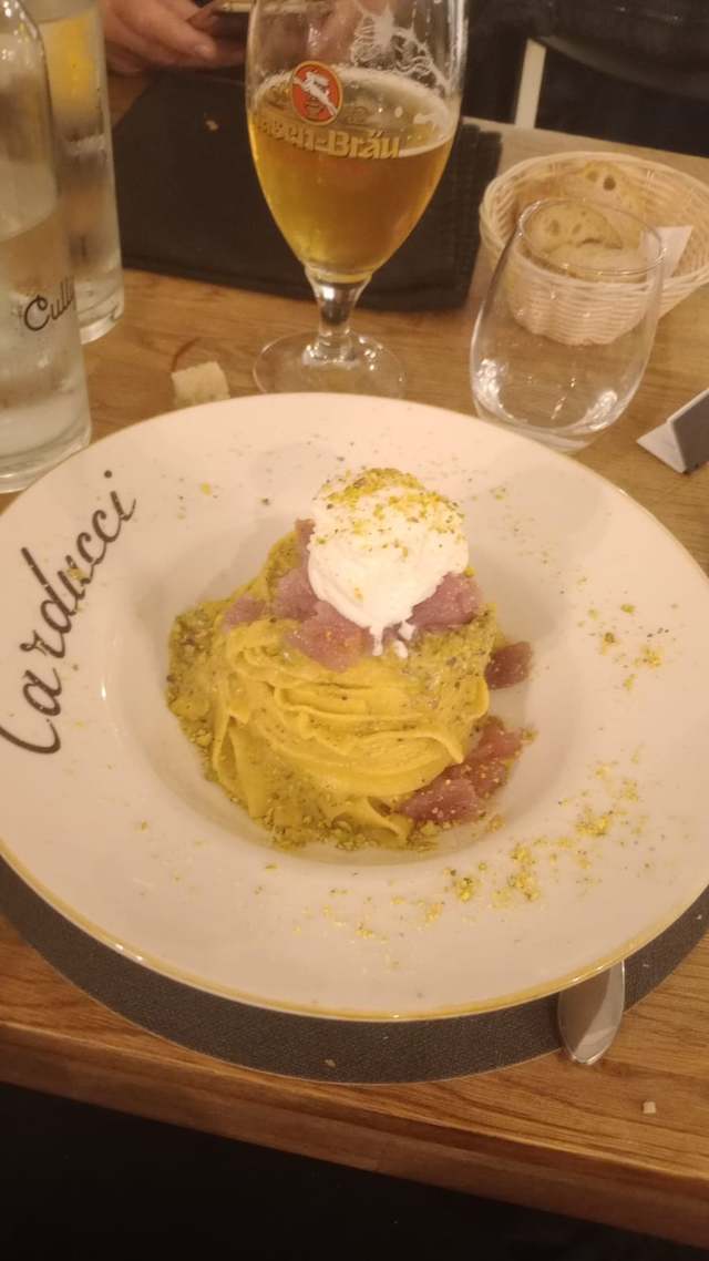 - Tagliatelle al pesto di pistacchio, spuma di burrata e tartare di tonno