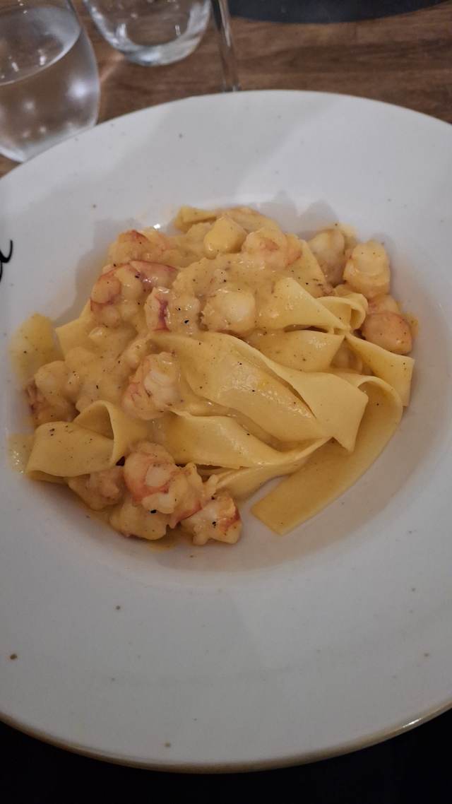 - Ravioli ripieni di bufala basilico e limone, bisque di gamberi