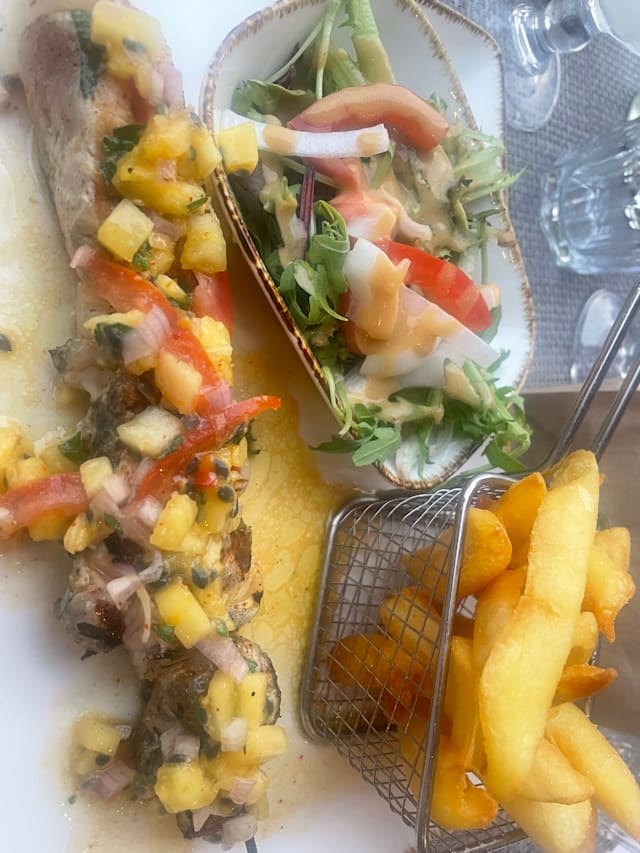 10/10Everything was great. Fish and chips served with real wide cut chips. We sat outside in the sun in February in short sleeves. It was great.