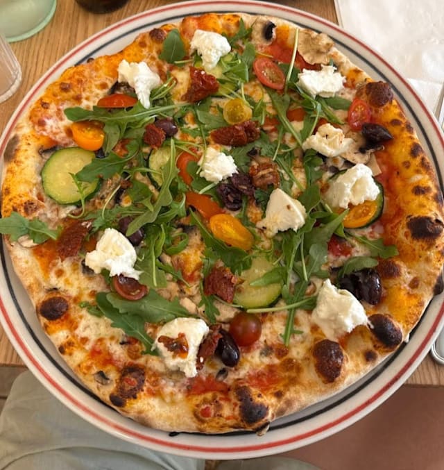 - Tomate, mozzarella, courgettes grillées, poivrons marinés, champignons, roquette, tomates cerises, origan, olives