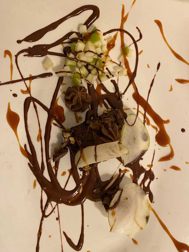 - Brownies al cioccolato fondente e noci pecan, namelaka al cioccolato mela verde granny smith e caramello salato