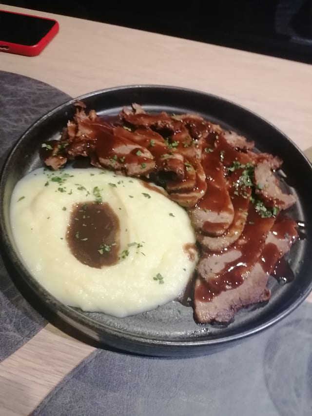 Fette di punta di petto di manzo affumicato servito con salsa al porto e purè di patate di robuchon.