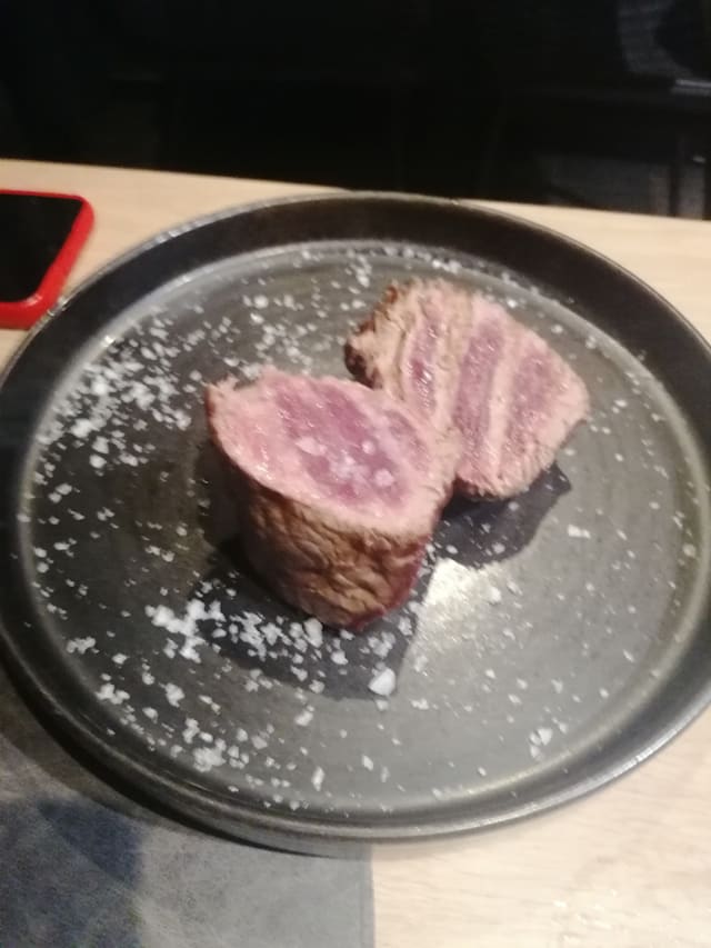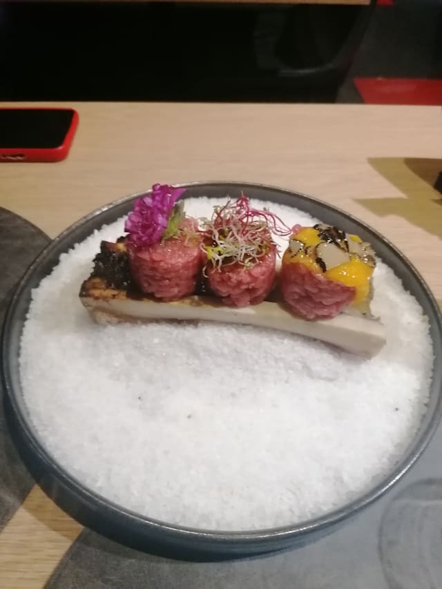 Tris di tartare” di manzo con crema d'uovo al parmigiano e olio al tartufo, glassa teriyaki zenzero, maldoln ed olio al bergamotto, servite su midollo grigliato