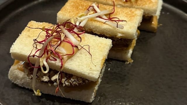 Pane bianco tostato farcito con brisket panato nel panko e fritto, julienne di cavolo bianco e katsu mayo.