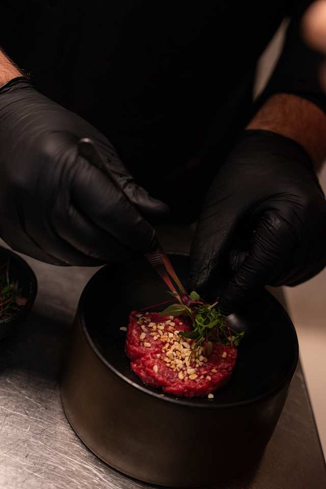 - Tartare di rubia gallega tagliata al coltello, maionese ai capperi, erbe aromatiche e delicate note affumicate