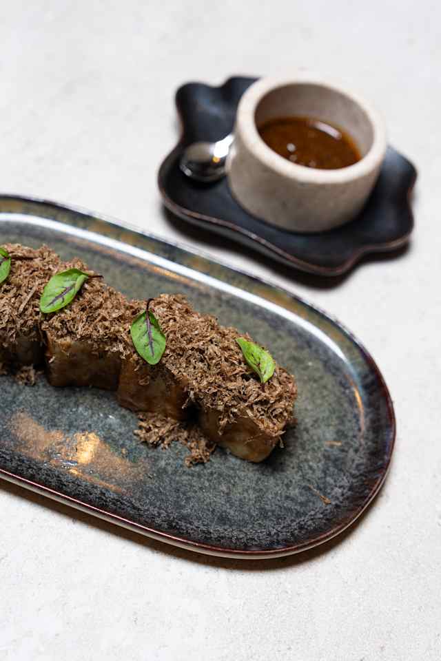 - Ravioli giapponesi ripieni di wagyu, shiitake e cavolo cinese, serviti con carnissage soy sauce