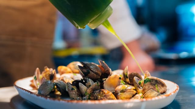 Mexilhões suculentos em molho de alho, ervas e natas. Um cheirinho que chama clientes da rua