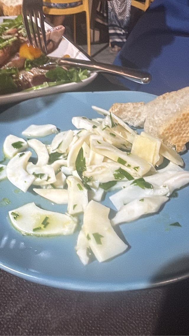 Marinata con olio, prezzemolo e limone, servita con crema di pistacchio, radicchio e pomodorini.