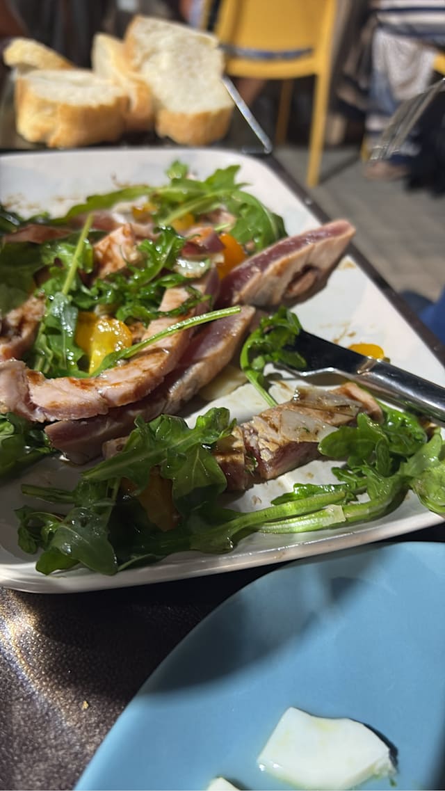 Servito con rucola, pomodorini, grana e aceto balsamico.