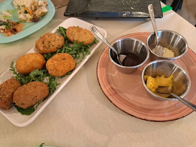 Baccalà in umido e patate, peperoni insaporiti al bbq, pomodorini gialli, insalata, stracciata, pesto di pomodorini secchi.